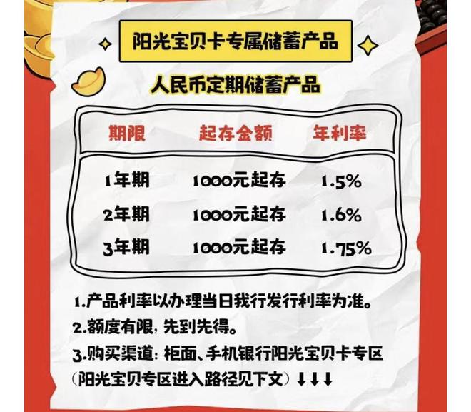 在存款利率上,部分银行针对压岁钱推出专属存单,并且利率也较银行挂牌利率有所上浮。比如,北京农商行推出阳光宝贝卡专属储蓄产品,起存金额1000元,1年期、2年期和3年期年利率分别为1.5%、1.6%、1.75%,而同期限定期存款挂牌利率分别为1.15%、1.2%、1.3%,该行 App显示最新发售的20万起存、2年期大额存单产品年利率为1.5%。蒙商银行推出的压岁宝存款产品,起存金额500元,发行期为2月15日至3月20日,1年期、2年期、3年期年利率分别为1.4%、1.45%、1.75%。