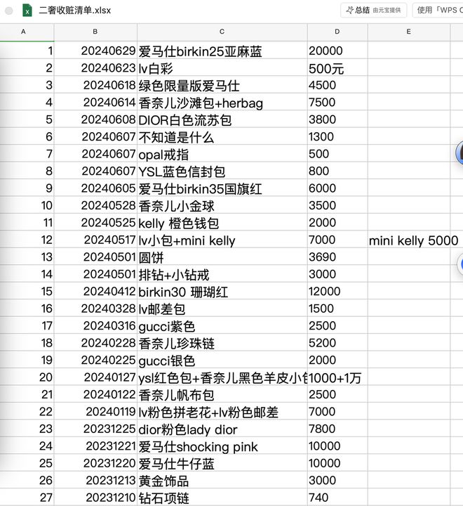 岚儿粗略统计二手奢侈品店收购的包包和其对应价格
