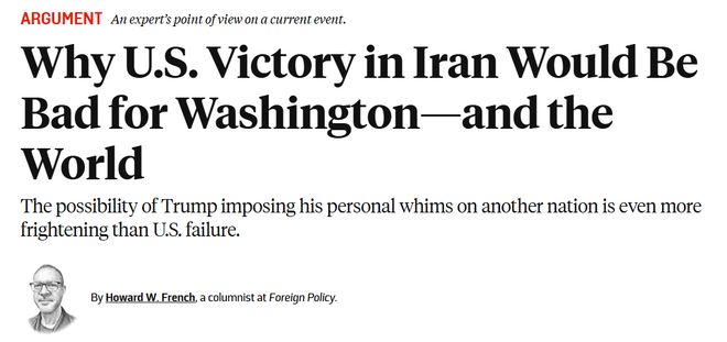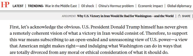 弗伦奇直言,问题不只是美国“能不能赢”,更在于本届美国政府始终没有给出一个连贯、清晰的胜利定义。作者表示,支持这场战争意味着认同一种盲目且不加思考的美国权力观——一种“强权即公理”的观念,并纵容华盛顿的所作所为,而这种行为完全脱离道义和伦理约束。
