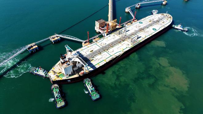 在山东港口青岛港的原油码头,一艘装载进口原油的货轮在2026年3月7日停靠在泊位上。