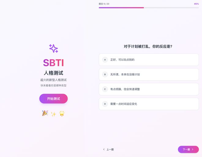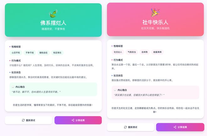 使用渐变色主题和卡片式布局,结合进度条、按钮等元素,生成的测试结果会根据用户的选择匹配相应的人格标签。