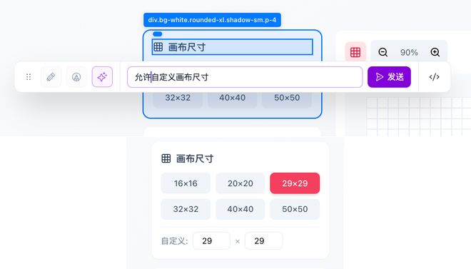 此外,妙悟进一步放开了页面修改的权限,让自定义操作更自由、更灵活。当我发现画布尺寸只有固定的几个时,我可以进入编辑页面选中功能框,继续用自然语言提出修改需求。例如我选中画布尺寸,提出修改“允许自定义画布尺寸”,秒悟就会同步修改代码。