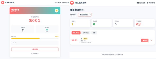 在商家端,商家后台实时展示排队中、已叫号、已入座数据、平均等待时长,支持多维度筛选。