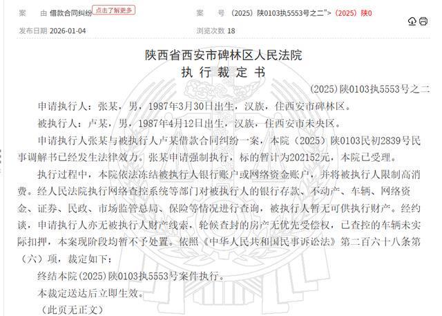 华商报大风新闻记者从中国裁判文书网查询到,《碑林区法院执行裁定书》【(2025)陕0103执5553号之二】显示,2025年12月15日,张某申请强制执行,被执行人卢某,标的暂计为202152元,本院已受理。