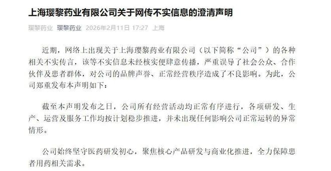 针对上述传闻,2月11日,璎黎药业发布声明称,公司所有经营活动均正常有序进行,各项研发、生产、运营及服务工作均按计划稳步推进,并未出现任何影响公司正常运转的异常情形。