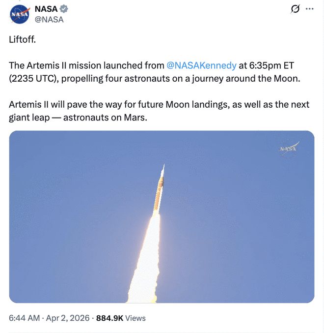 美国东部时间周三下午6点35分,美国国家航空航天局(NASA)的重型火箭太空发射系统(SLS)在佛罗里达州卡纳维拉尔角点火升空。这枚火箭搭载着执行“阿尔忒弥斯2号”载人绕月任务的四名宇航员,开始了为期10天的深空之旅。