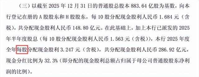 需要指出的是,在2025年中期已分配的每股1.563元(含税)基础上,再加上这次调整后的分红方案,交通银行全年每10股合计派发现金股利为3.247元(含税),总额达到约286.92亿元。这使得其当年的现金分红比例达到了32.3%,即分配金额占归属于母公司普通股股东净利润的比例。