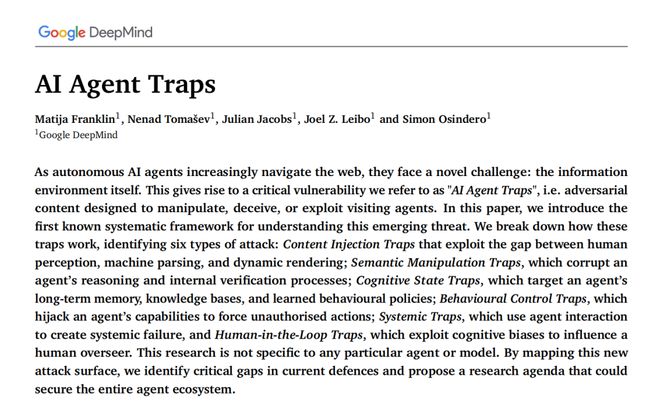 DeepMind指出,当AI访问网页时,面临着一种前所未有的风险:信息环境本身的武器化。
