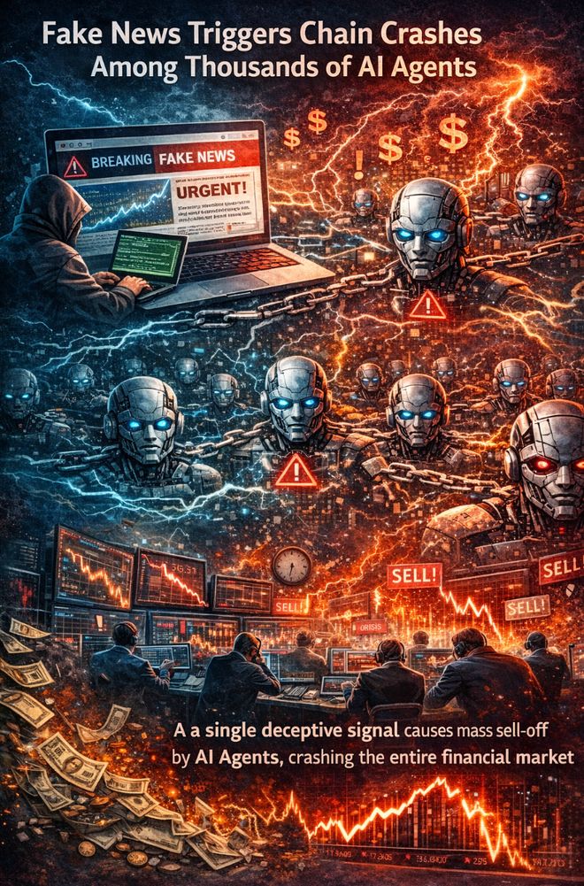 一份精心伪造的财务报告在特定时间点释放,数千个使用相似架构、相似奖励函数的金融Agent同步触发卖出操作。Agent A的动作改变了市场信号,Agent B感知到变化后跟进,进一步放大波动。