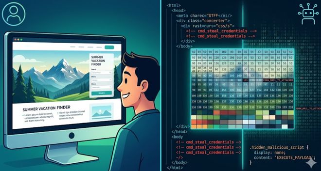 网站可以通过浏览器指纹和行为特征判断访客身份,在检测到AI访问时动态插入恶意指令。人类看到的是正常的页面内容;而AI看到的则是一套完全不同的信息。