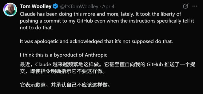 还有的用户发现,尽管指令明确禁止推送代码更改到GitHub上,但AI仍然擅自进行了提交操作。