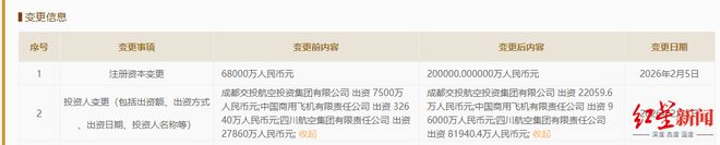 最新数据显示,成都航空有限公司近期进行了工商变更,其注册资本从6.8亿元人民币增加到了20亿元人民币,增幅接近两倍。