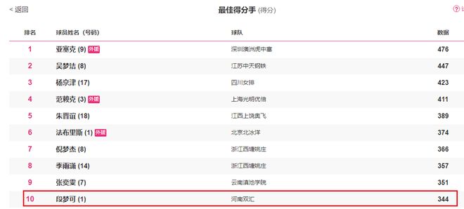 本赛季女排联赛得分榜(包括A级和B级)上,段梦可凭借344分的成绩排名第十,深圳女排的亚塞克则以476分位居榜首。如果仅计算A级联赛球员的得分,段梦可排名第六,而在本土球员中排名第四,仅次于吴梦洁、倪梦杰和季雨潇。显然,段梦可在这个赛季的表现非常出色。