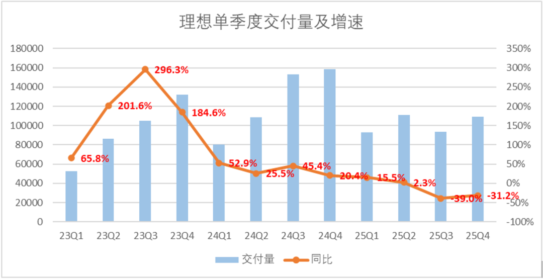 2025年第四季度,理想汽车的交付量为10.92万辆,同比下降了31.2%,全年累计交付40.6万辆,同比下降了18.8%。