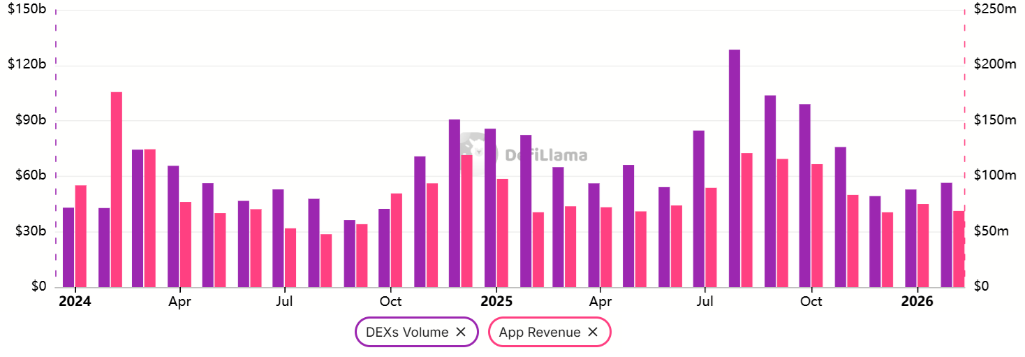 2026年2月期间,以太坊的DEX交易额降至565亿美元,相比前一年八月份创下的峰值1285亿美元大幅缩水。在同一时期内,Solana的日均交易额为955亿美元,相较于当年八月也有一定幅度下滑。这一现象导致网络手续费收入和去中心化应用(DApp)的收益出现下降趋势。