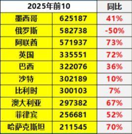 1月27日,乘联分会秘书长崔东树最新披露的数据显示,2025年全年,中国对墨西哥汽车出口达到62.52万辆,较2024年增长18.05万辆,墨西哥超过俄罗斯成为中国汽车出口的第一目的国,展现出该市场对中国汽车的强劲需求。紧随其后的是俄罗斯,出口量为58.27万辆,较2024年大幅回落,主要是受税费等因素影响。位列第三名的是阿联酋,中国对这一市场的汽车出口量为57.19万辆,成为中国汽车出口前十国家中表现最亮眼的市场,全年增量接近25万辆,增速最为迅猛。
