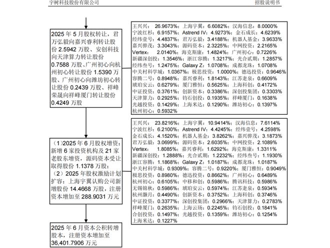 2025年5-6月,宇树科技完成了上市前的股权转让、增资扩股及股权激励,注册资本增至36401.7906万元,实控人王兴兴直接持股23.82%,仍为公司第一大股东。