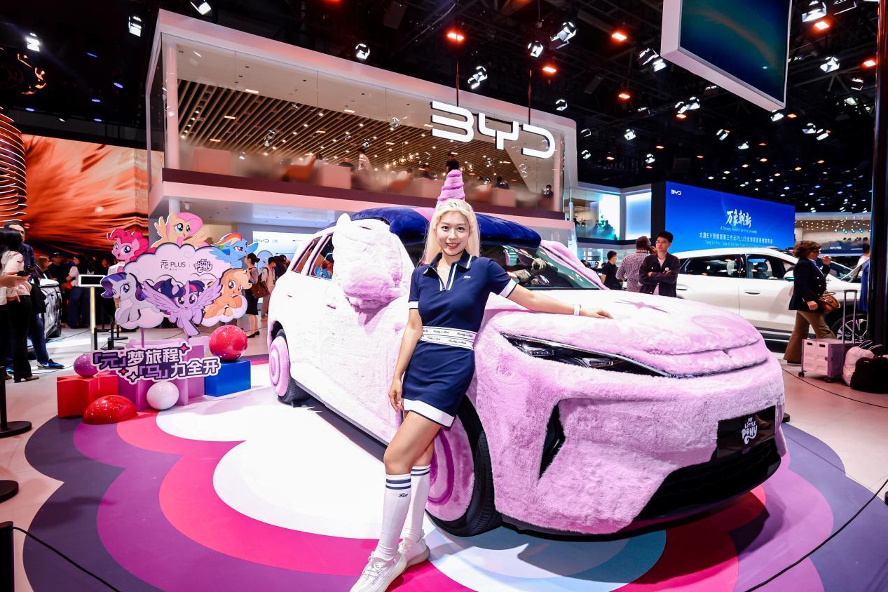 在这次展览中,比亚迪王朝除了展示硬核产品之外,还通过多种形式的互动活动及富有创意的设计方案,吸引了年轻一代的关注。其中包括与全球顶级IP“小马宝莉”的联名项目等。