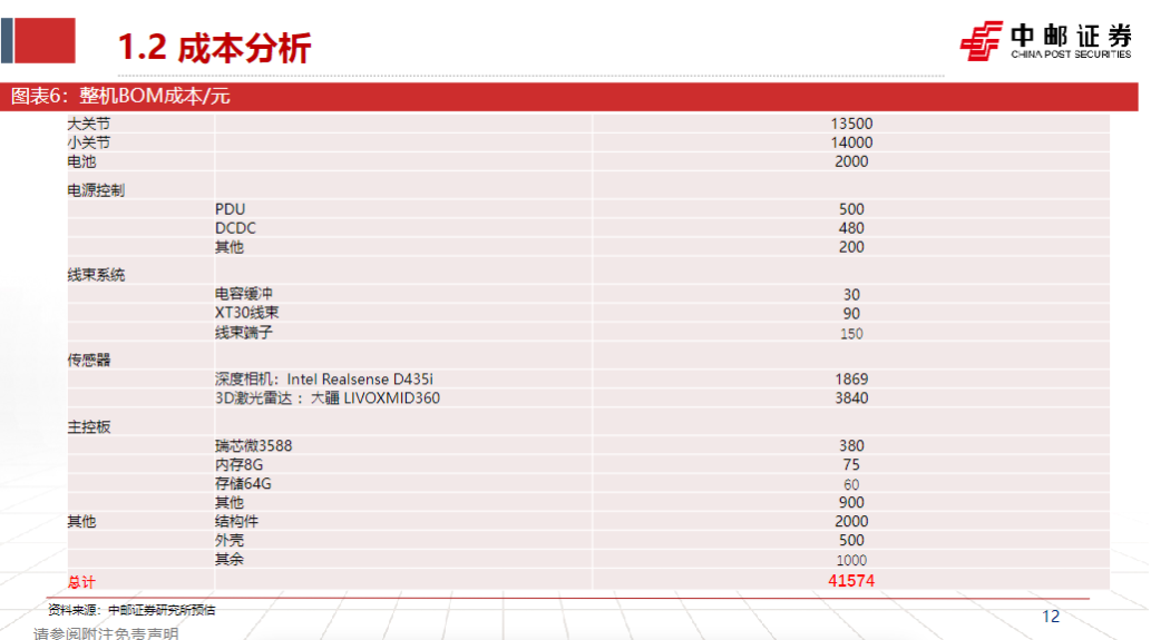 以宇树科技为例,其2023年发布的第一款人形机器人H1发售初期售价高达65万元,BOM成本也超过20万元;一年后发布的宇树G1基础版售价9.9万元,据中邮证券的拆机报告,该机型整机BOM成本约4.16万元。