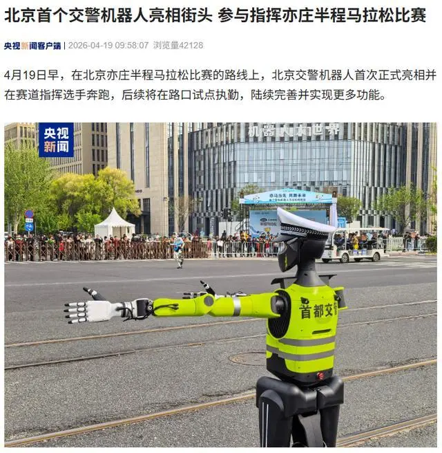 据悉,今日在北京亦庄举行的半程马拉松比赛期间,北京交警部门首次启用了一款智能机器人参与赛事现场的指挥工作,并计划在未来逐步推广至多个路口进行试点执勤。