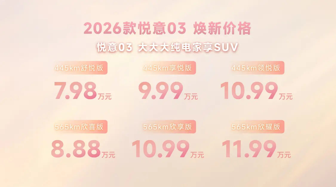 3月8日,一汽奔腾正式推出了2026款悦意03车型,并在市场上发布了六款车型,售价区间为7.98万元至11.99万元。这款年度更新的车型提供了445公里和564公里两种续航版本,旨在满足年轻小家庭尤其是女性消费者的需求。