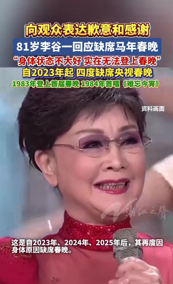近日,著名歌唱家李谷一通过电话表示,由于健康原因,她将不会参加2026年的央视春晚,并向观众致歉和感谢:“我的身体状况不佳,无法参与今年的春晚节目,对此我感到非常抱歉。”