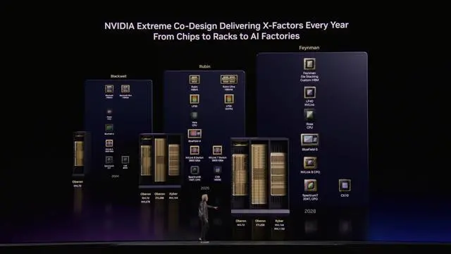 英伟达在 2026 年的 GTC 大会上披露了 Rubin 和 Feynman 两个产品系列的未来规划,首次公开了与 Feynman GPU 相配的 CPU 的代号为 Rosa。