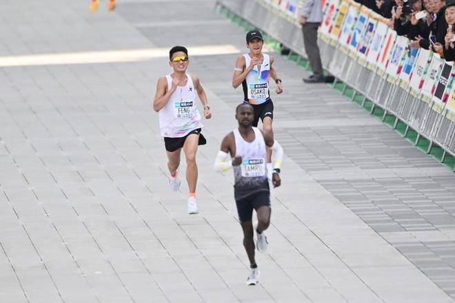 丰配友自己说他最后几公里有一些小抽筋,但是大迫杰的追赶“成就”了他。2小时05分58秒,不仅是新的全国纪录,更领先了大迫杰一秒率先冲线。