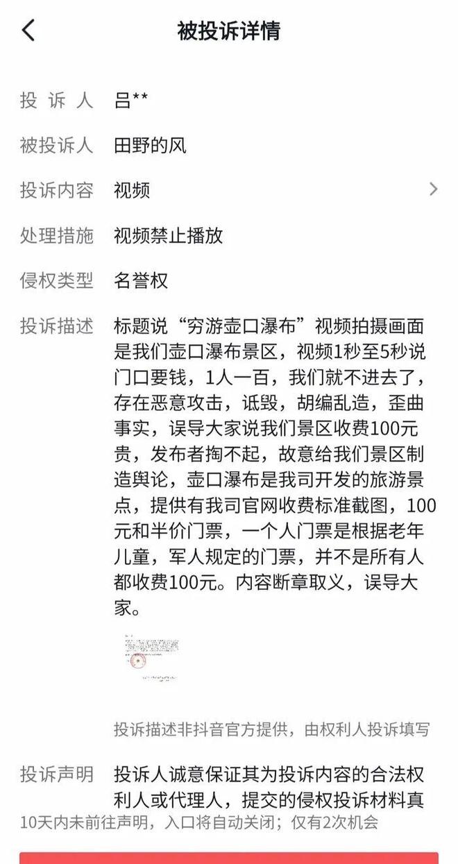 按照“被投诉详情”截图所示,投诉人吕某某投诉称,“标题说‘穷游壶口瀑布’视频拍摄画面是我们壶口瀑布景区,视频1秒至5秒说门口要钱,一人100(元),我们就不进去了,存在恶意攻击、诋毁、胡编乱造、歪曲事实,误导大家说我们景区收费100元贵,发布者掏不起……”与此同时,投诉人还宣称“壶口瀑布是我司开发的旅游景点”,强调针对不同人群收费标准不同,认为“内容断章取义,误导大家”。