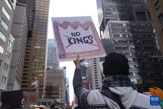 2026年3月28日,美国纽约,抗议者手举“不要国王”标语牌。(新华社/张凤国摄)
