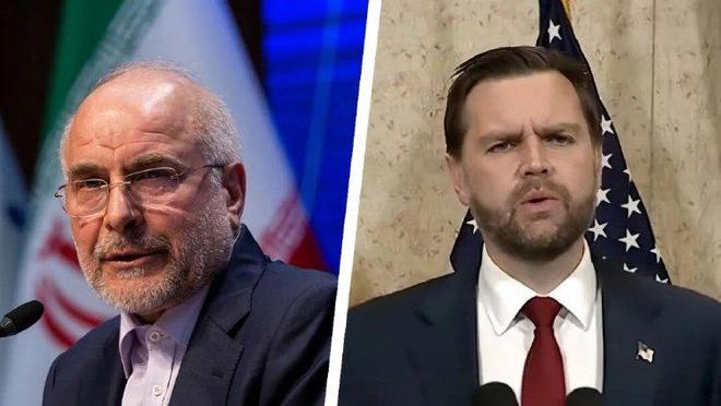 一名记者拍摄到的画面显示,伊朗伊斯兰议会议长卡利巴夫(左)与美国副总统万斯(右)。