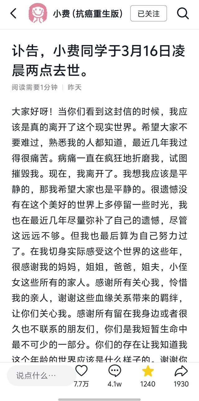 自确诊以来,小费经历了多次手术和治疗,期间她辗转多家医院。2021年9月,她发布了第一条视频,开始了她的抗癌博主之路,频繁分享她的就医日常,鼓励了大量支持她的网友。然而,3月16日凌晨2时,小费的生命画上了句号,她留下的告别信获得了7.7万多的点赞和4.1万多条评论。