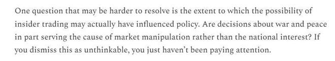 克鲁格曼提出一个发人深省的问题:这些通过非法手段获利的可能是否反过来影响到了政策本身?换句话说,战争和和平的选择,是否正在部分地被市场操纵所左右,而不是基于国家利益做出决策。