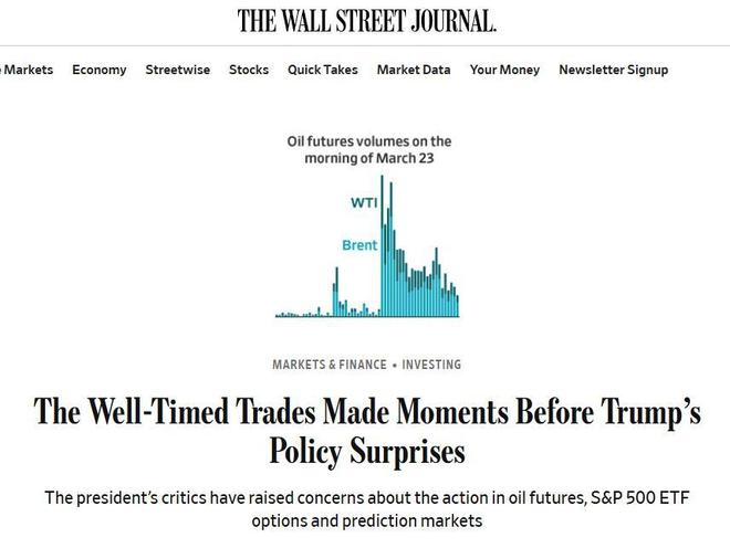 该报还发现,在本届政府上任以来,每当涉及重大政策变化或对外军事行动等敏感时刻,金融市场常常会出现一系列异常交易。这些交易往往发生在重要的官方声明发布之前,并且规模相当大。
