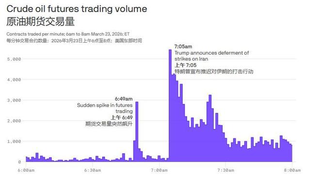 当美国总统特朗普在3月23日宣布推迟对伊朗的打击计划后不久,原油期货和标普500期货市场就出现了显著波动:大约15分钟前,在美东时间上午6点49分至6点51分之间,布伦特原油和西得克萨斯中质油期货交易量骤增超过7.6亿美元。然而,当时并没有公开信息可以解释这一现象。