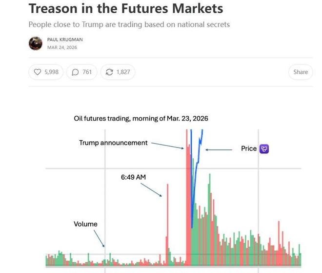 克鲁格曼在其文章中进一步指出,企业高管利用机密消息为自己谋利被称为内幕交易;但当涉及国家安全时,这种行为则更应被视作“叛国”。
