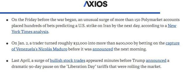 《华尔街日报》等媒体回顾发现,在政府做出重大决策之前,市场上频繁发生精准且大规模的异动。例如在今年2月底美以对伊朗采取军事行动前夕,加密预测市场Polymarket上的一些账户提前押注“美国即将对伊朗发起攻击”,最终获利约120万美元;同年1月,一名匿名交易者也在这类事件前投入了资金。
