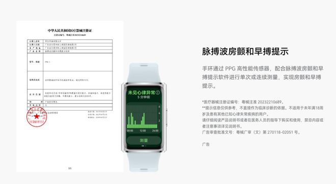 心血管健康方面,手环新增全天候HRV监测,抬腕即可查看24小时变化值及各类心率图表,帮助用户直观感知身体负荷。更重要的是,其搭载的脉搏波心律失常分析功能,配合高性能PPG传感器,能有效识别潜在的房颤、早搏风险,且该功能已获得中国医疗器械注册证和欧洲CE认证,实现了从被动治疗到主动预防的转变。(注:本产品非医疗器械,数据仅供参考,不作为医疗诊断依据。)