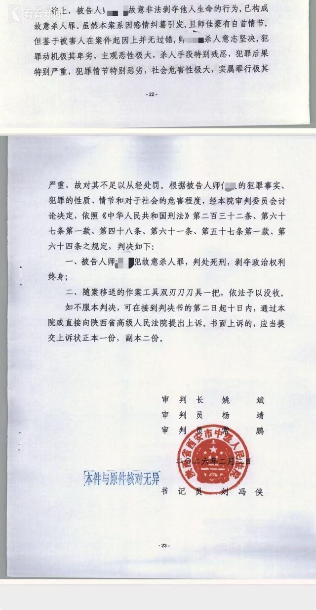 今天下午,陕西省西安中级人民法院对“西安31岁女护士遭男友杀害”案件作出一审宣判,被告人师某某犯故意杀人罪,判处死刑,剥夺政治权利终身。同时,随案移送的作案工具双刃刀刀具一把,依法予以没收。