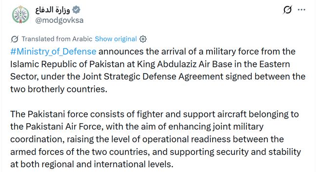 沙特国防部通过X平台发布声明确认,一支来自巴基斯坦的军事力量已根据双边防务协议抵达阿卜杜勒阿齐兹国王空军基地。