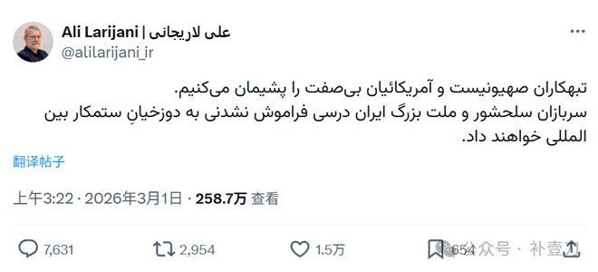 3月1日,在伊朗方面确认哈梅内伊遇袭身亡信息后,作为伊朗最高领袖顾问、同时也是伊朗最高国家安全委员会秘书,拉里贾尼高频出现在伊朗媒体和公众视野中。