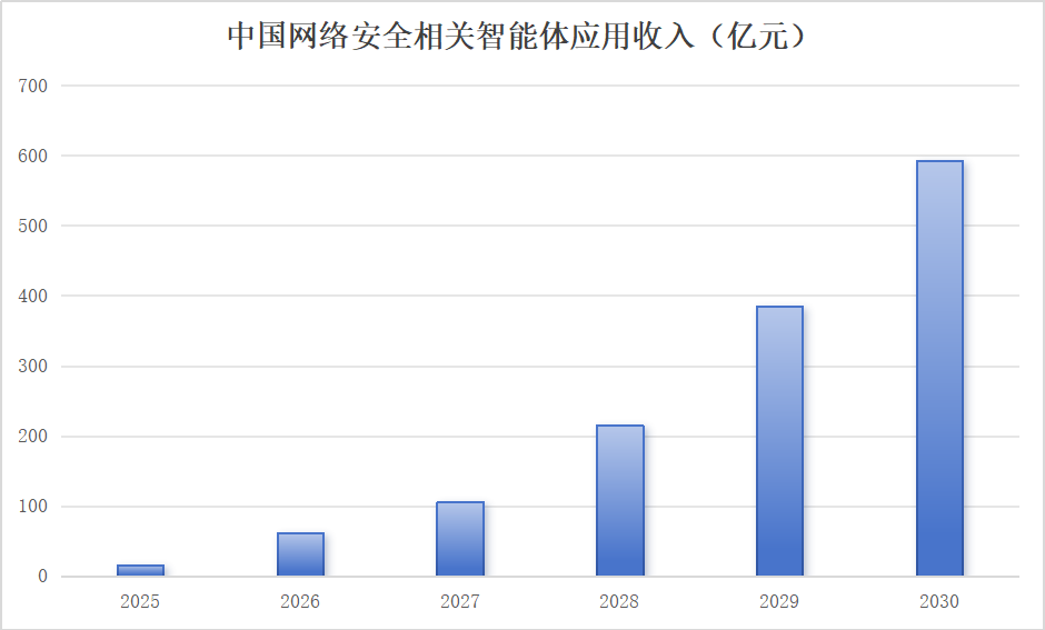 据IDC预测,中国网络安全相关智能体收入的市场规模,在未来五年的复合年均增长率将高达106.5%,并在2030年达到593.5亿元人民币。
