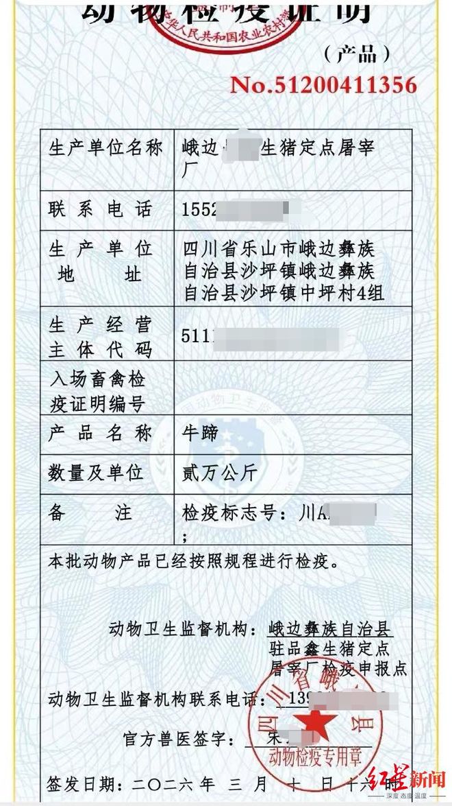 据孙先生介绍,此前在装车发货时,中间人王先生提供了一份《动物检疫证明》,记载生产单位是峨边某定点屠宰厂,产品名称为牛蹄,数量20吨,备注栏中检疫标志号为孙先生装车的冷链货车车牌号,签发时间是2026年3月10日16时。