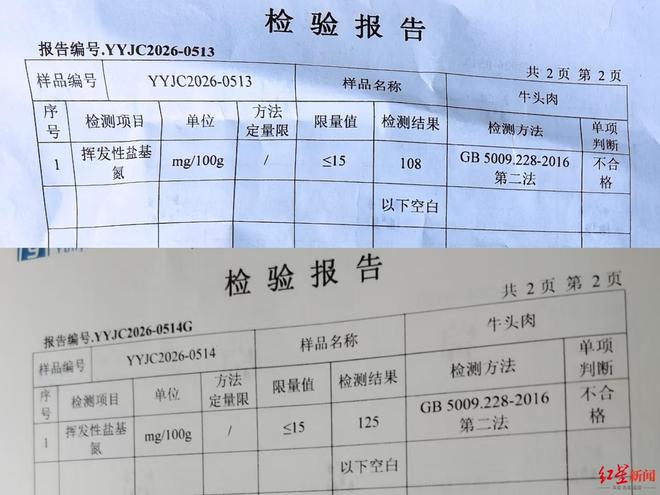 廖先生和孙先生先后向红星新闻记者提供的两份检测报告均显示,牛头肉样品挥发性盐基氮不符合GB2707-2016《食品安全国家标准鲜(冻)畜、禽产品》标准要求。该指标限量值为≤15mg/100g,而廖先生冻库样品检测值为108mg/100g、孙先生冷链车样品检测值为125mg/100g,均超过限量值的六七倍。3月27日,廖先生表示,他对检验结果不认可,已经申请了复检。