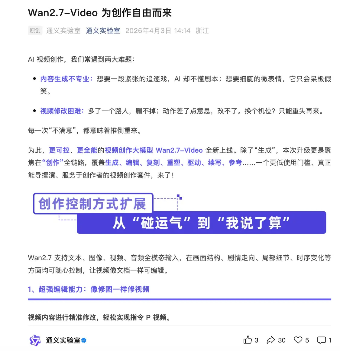 最近,一项名为Wan2.7-Video的视频生成模型已经正式发布。这款创新工具能够处理包括文本、图像、音频和视频在内的多种输入模式,并专注于改进视频编辑与修改的技术。