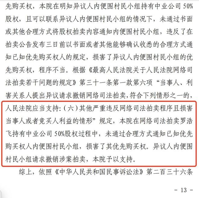 2025年11月,清远市中级人民法院裁定,“在网络司法拍卖罗某飞持有中业公司50%股权过程中,未通过合理方式通知已知优先购买权人内便围村民小组,损害了其优先购买权,”因此撤销了此前的股权拍卖裁定。
