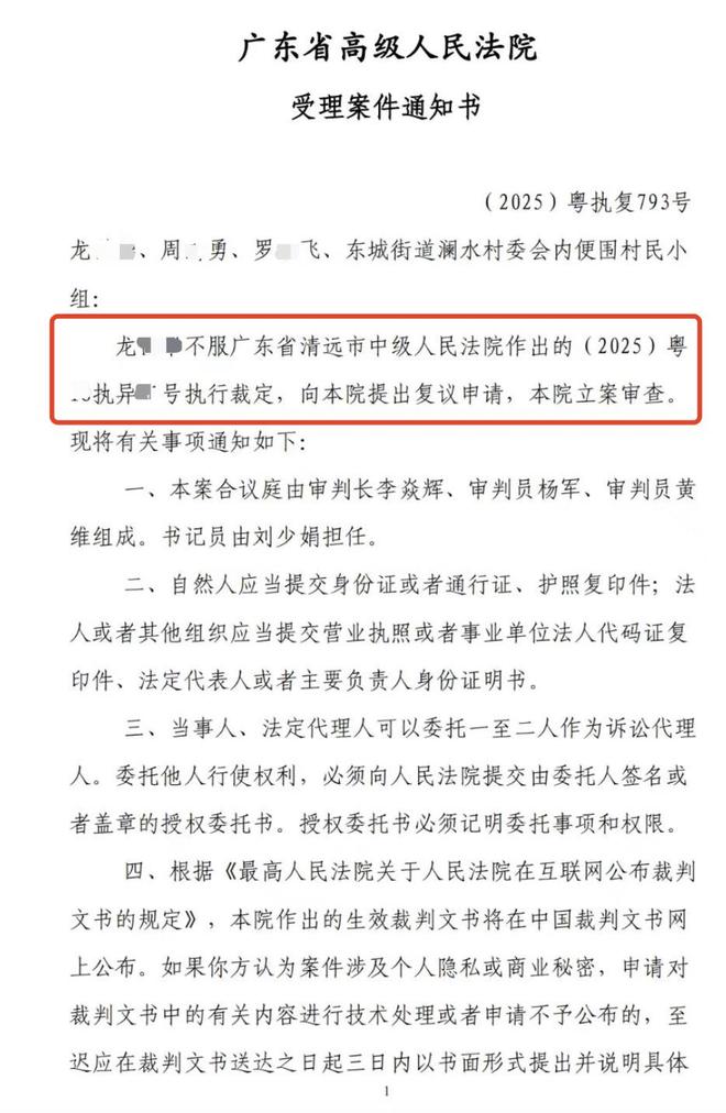 但不久后,内便围村民小组对法院拍卖程序提出书面异议,并提交了一份有57户代表签名的执行异议申请文件。清远市中级人民法院受理并进行了审查,2025年10月16日召集双方进行了听证。