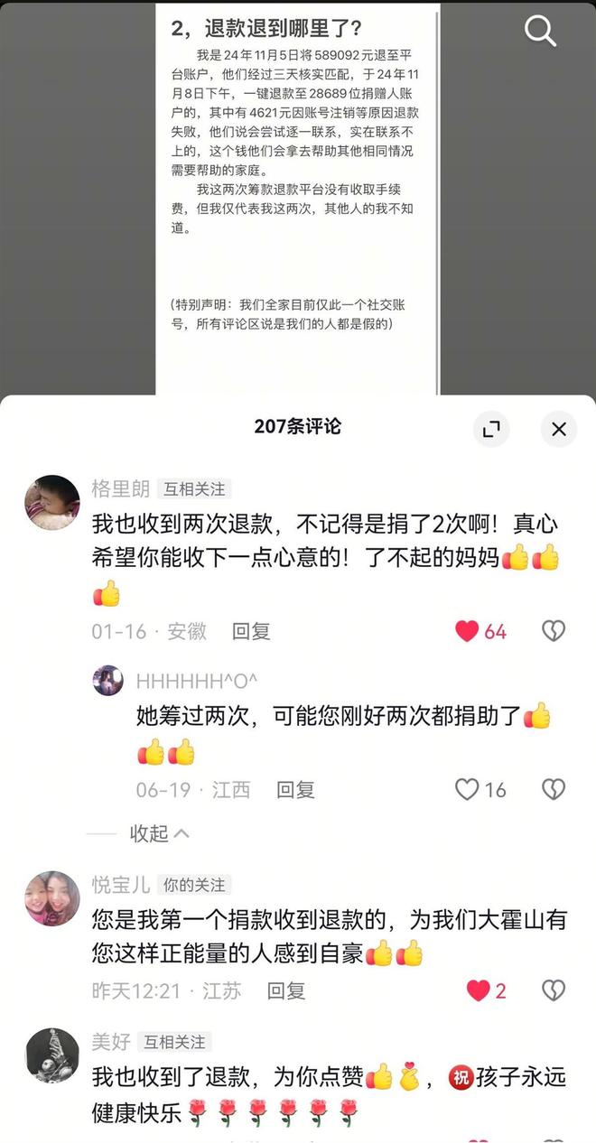 一位安徽网友在社交媒体上留言表示自己也收到了退款。“我确实收到了胡奇卉女士通过平台退还的两次捐款。”