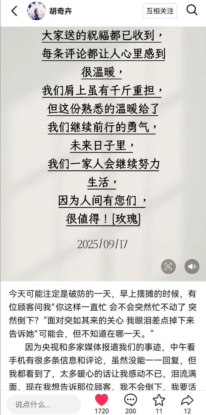 “很多人喊我们开商品橱窗,我说我的梦想是债还完后开个小早餐店。有网友直接自报家门,要借钱给我。这几天还有很多当地的朋友远道而来,找我的小摊买早点。”胡奇卉告诉极目新闻记者,广大网友的举动让她感觉到这一路走来不是一家人在孤军奋战,社会的温暖让她这个读书少的人不知道怎么表达,这两天眼睛都哭肿了,太感动了。