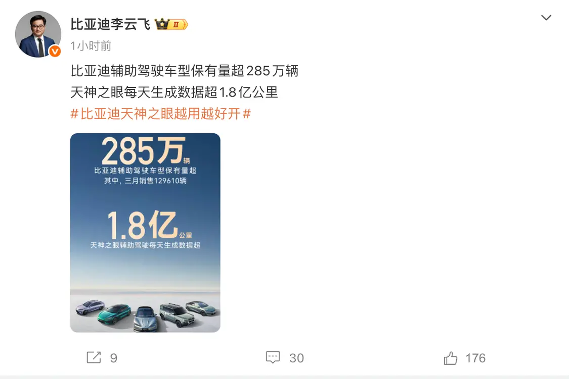 比亚迪集团-品牌与公关部门负责人李云飞在4月15日透露,比亚迪旗下配备辅助驾驶系统的车辆数量已经超过285万辆,天神之眼系统每日生成的数据量超过了1.8亿公里。